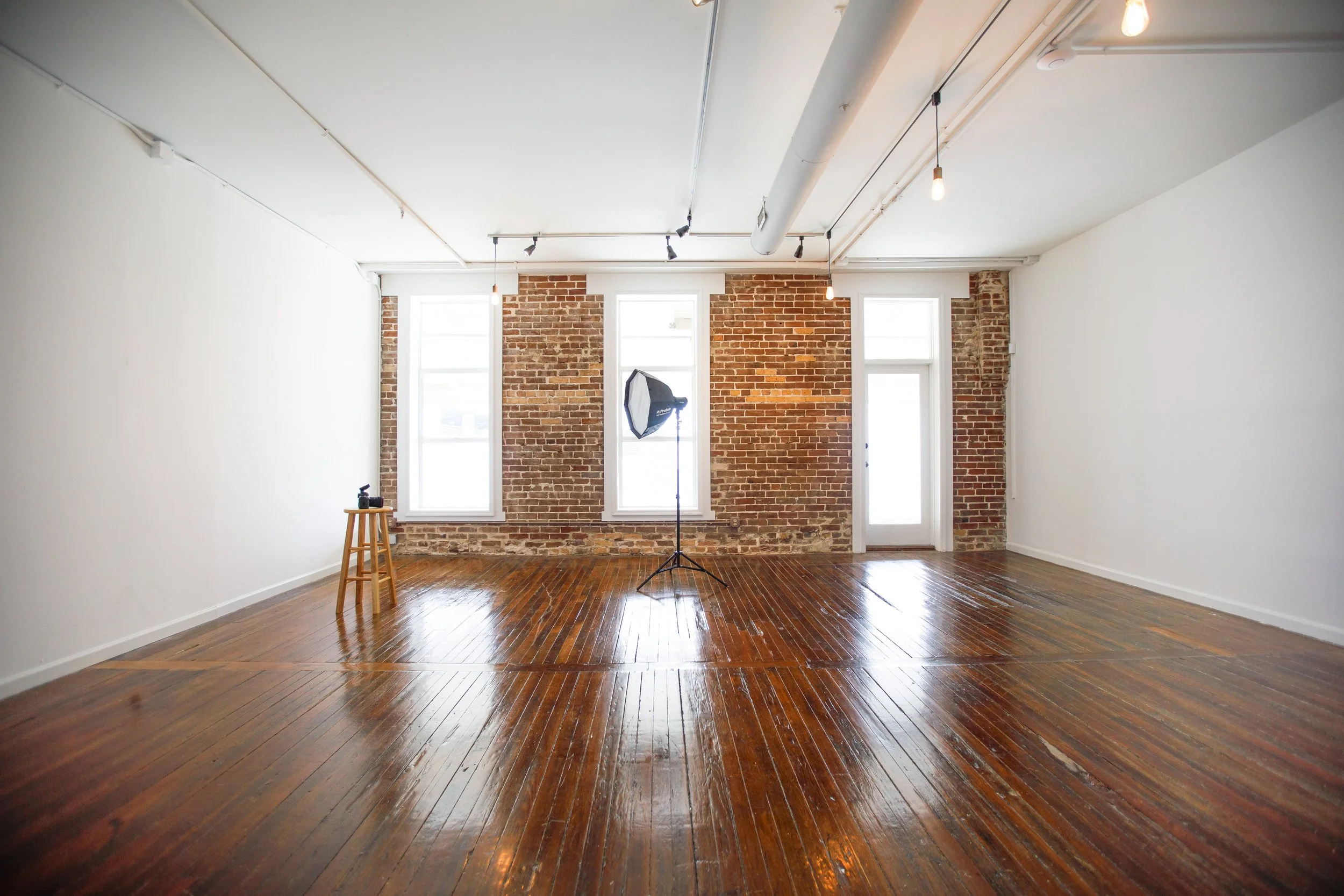 A spacious 900 square feet of creative potential. Our studio rental includes versatile paper options, perfect for a variety of photoshoots and events. Amenities include a convenient kitchenette, a modern bathroom, and a dedicated hair and makeup station to ensure your subjects look their best. Administrative workstation is available if needed. The studio has full natural light, highlighting the charming exposed brick walls. This well-equipped space is designed to provide everything you need for a successful and comfortable production or event.